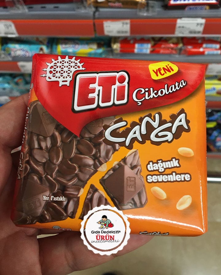 “Dağınık severlere” sloganıyla bilinen Canga markasıyla market raflarındaki sütlü çikolatalar arasında dikkat çeken Eti Canga Sütlü Çikolata ürününü inceliyoruz. Ürün 60 gr.’lık paketlerde satılıyor. Ürün ambalajında “yer fıstıklı” ifadesi yer alırken, ayrıca yer fıstığı görselleri de dikkat çekiyor. Ürün yasal ismiyle yer fıstığı ve karamel parçacıklı sütlü çikolata olarak geçiyor.