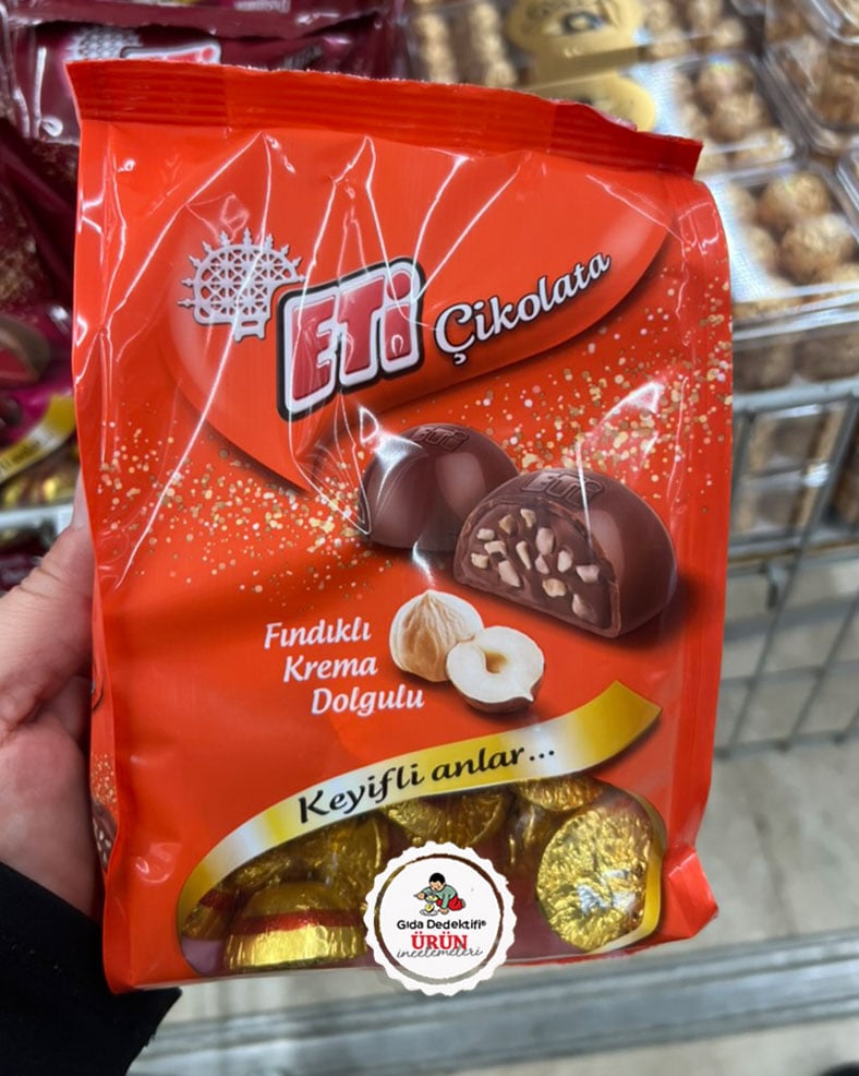 Eti tarafından Eskişehir’deki tesislerde üretilerek satışa sunulan ve bayram öncesinde market raflarında rastladığımız Fındıklı Kremalı Dolgulu çikolata ürününü inceleyeceğiz. Ürün 300 gr’lık paketlerde tek adedi yaklaşık 8 gr olan fındıklı çikolatalar içeriyor. Tek tek paketlenmiş çikolataların ambalajında ise fındık görselleri yer alıyor. Ürün tüm fındık değil, fındık parçaları içeriyor ve üründeki fındık oranı %10 olarak beyan ediliyor.