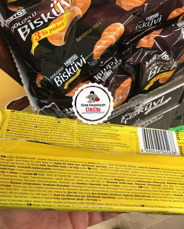 🔎İçindekiler: Muzlu Krema (%68) [Şeker, Hindistan Cevizi yağı, Süt tozu, Glikoz şurubu, Peynir altı suyu tozu, Buğday unu, Bitkisel yağ (Ayçiçek, Pamuk), Muz tozu (%0,5), Renklendirici (Beta Karoten), Aroma vericiler, Tuz], Gofret yaprağı (%32) [Buğday unu, Malt ekstraktı, Nişasta, Kakao, Tuz, Emülgatör (Ayçiçek lesitini), Hindistan Cevizi yağı, Kabartıcılar (Sodyum Hidrojen Karbonat, Sodyum Asit Pirofosfat, Amonyum Hidrojen Karbonat), Maya esktraktı]