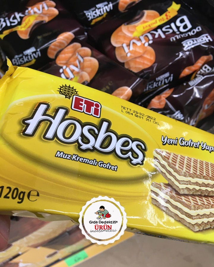 Uzun süredir raflarda olan fakat son dönemde yenilenen içeriğiyle ambalajları dikkatimizi çeken Eti Hoşbeş Muzlu Kremalı Gofret ürününü inceliyoruz. Ürün ambalajında Yeni gofret yaprağı ve muzlu krema ifadesi yer alıyor. Üründe %68 oranında muzlu krema ve %32 oranında gofret yaprağı bulunuyor. Ürünün 120 gr.’lık paketlerde satıldığını söyleyelim.