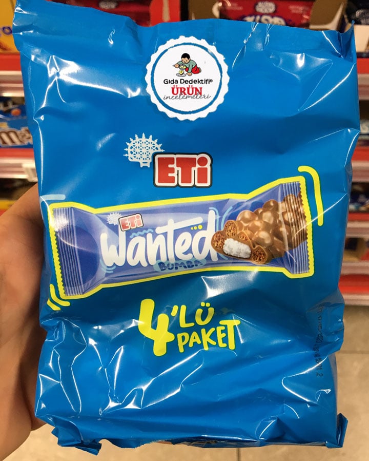 Eti markasıyla yıllardır piyasada yer alan Wanted ürünlerinden 4’lü paketlerde satılan Eti Wanted Bumba Sütlü Çikolata kaplı mısır, buğday gevrekli ve hindistan cevizli bar ürününü inceleyeceğiz. Ürün 128 grl’lık paketlerde satılırken, tek adet ürünün 32 gr. olarak üretildiği görülüyor. Ürün Eti Gıda tarafından Eskişehir’deki tesislerde üretilirken, içeriğinde alkol, domuz yağı ve türevleri bulunmadığı beyan ediliyor.