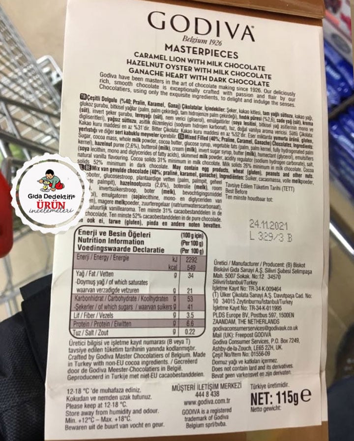 Önceki günlerde bir Migros mağazasında dikkatimizi çeken “ithal çikolata” ifadesi altında satılan Godiva markalı Masterpieces serisinden “An assortment of legendary chocolates” ürününü inceleyeceğiz. Buraya kadar bir problem yok. Godiva bildiğimiz üzere Belçika’nın en bilinen çikolata markalarından biri – ki geçtiğimiz yıllarda Ülker tarafından satın alındığını biliyoruz. Ürün üzerindeki yazılar, görseller, “Belgium 1926” ifadesi ve Migros tarafından düzenlenen “ithal çikolata” reyonunda Belçika’dan ithal edilmiş bir çikolata olarak satılıyor. Fakat gelin görün ki; ürün Ülker ve Ülker’e bağlı firmalardan olan Biskot Bisküvi tarafından İstanbul Silivri ve İstanbul Davutpaşa’daki fabrikalarda üretiliyor. Godiva markasının “efsanevi çikolataları” olarak bilinen üç farklı çeşidi; “Aslan figürlü karamelli sütlü çikolata”, “Kalpli bitter çikolata” ve “Deniz kabuğu şeklindeki fındıklı sütlü çikolata” bulunan ürün 115 gr.’lık paketlerde satılıyor.