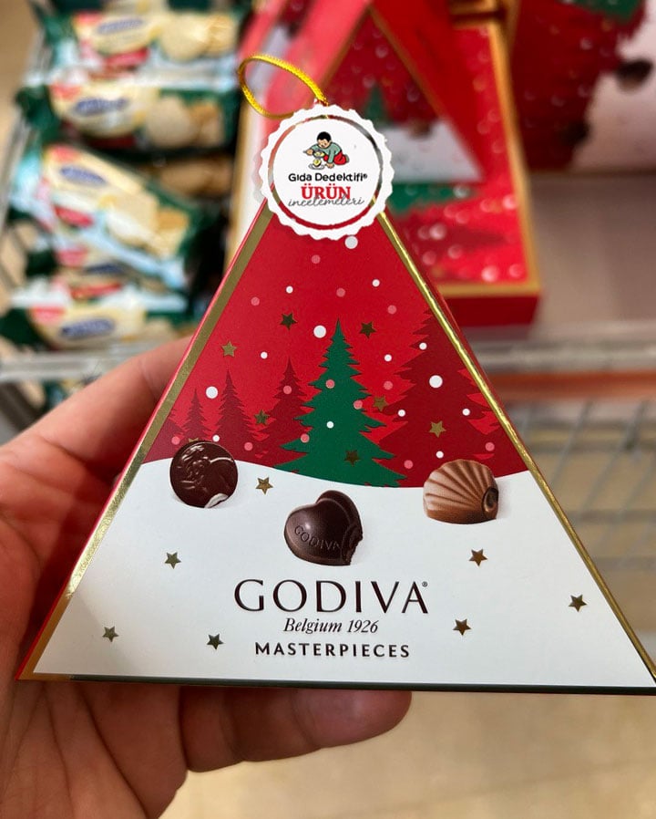 Godiva markasıyla ve “Belçika 1926” ifadesiyle satışa sunulan yılbaşı konseptli çikolatayı inceleyeceğiz. Ürün markası ve sloganı sebebiyle Belçika’dan geliyor gibi algılansa da aslında Ülker Bisküvi Sanayi Anonim Şirketi’nin Silivri’deki fabrikalarında üretiliyor. Ürün içeriğinde çeşitli aromalı ve dolgulu bitter ve sütlü çikolatalar bulunuyor.