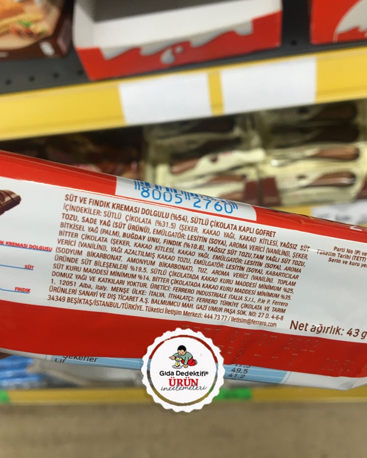 Ürün içeriğine baktığımızda ilk sırada %31,5 oranında sütlü çikolata yer alıyor. Sütlü çikolata içeriğinde ise şeker, kakao yağı ve kakao kitlesi bulunuyor. Sütlü çikolata içeriğinde ayrıca sade yağ, soya lesitini ve aroma verici olarak vanilin bulunuyor. Ürün içeriğinde sütlü çikolata dışında sırasıyla; sofra şekeri ve palm yağı bulunuyor. Ürün bu haliyle 43 gr.’lık tek pakette 17,7 gr. yani yaklaşık 8 tane küp şeker kadar ilave şeker içeriyor. Bu da 21,5 gr.’lık tek adet gofrette yaklaşık 4 tane küp şeker bulunduğunu gösteriyor. Süt ve Fındık Kreması dolgulu olarak satılan ürün içeriğinde %10,8 oranında fındık ve beyan edilmeyen oranda yağsız süttozu bulunuyor. Üründe ayrıca aroma verici olarak vanilin ve emülgatör olarak soya lesitini yer alıyor.
