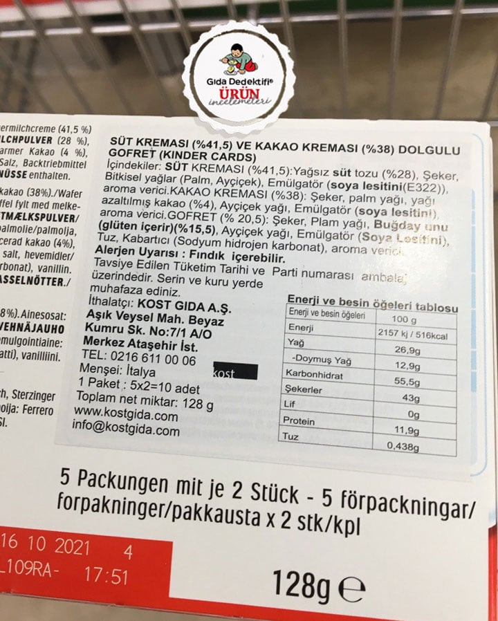 Bugün markette fiyatıyla dikkatimizi çeken Kinder Cards ürününü inceleyeceğiz. Ürün İtalya’dan ithal edilerek ülkemizde satılıyor. 128 gr.’lık ambalajda 5’er adet paketlerde 25,6 gr.’lık kart şeklinde ince dolgulu gofretler içeren ürünün mevzuata uygun tanımı ise süt kremalı ve kakao kremalı dolgulu gofret olarak geçiyor.