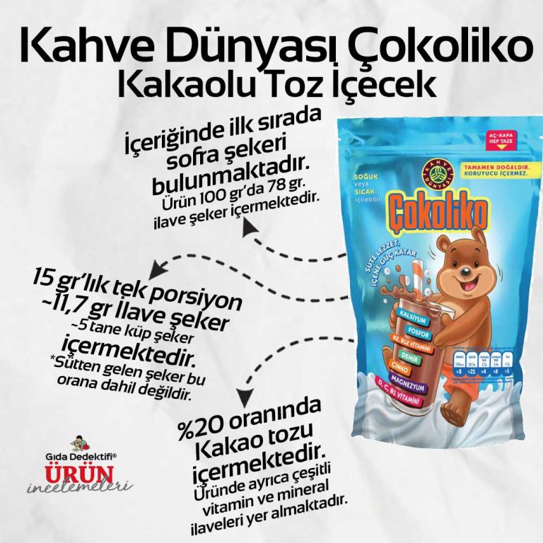 Ürün içeriğinde baktığımızda %41 oranında süt kreması, %38 oranında kakao kreması ve %20,5 oranında gofretten ibaret olduğunu görüyoruz. Üründe %41 oranında süt kreması içeriğinde yağsız süt tozu oranı %28 olarak görülüyor – ki bu da üründe %11 oranında süt tozu bulunduğunu gösteriyor. Süt kreması olarak tanımlanan içerikte süt tozunun yanı sıra sırasıyla; sofra şekeri, Bitkisel yağlar – Palm ve ayçiçek yağı ile soya lesitini ve içeriği bilinmeyen aroma verici bulunuyor. Üründe kakao kreması ise ilk 3 sırada; sofra şekeri, palm yağı ve %4 oranında kakao tozunun bulunduğu bir içeriğe sahip. Kakao kremasında ayrıca ayçiçek yağı ve soya lesitini ile içeriği bilinmeyen aroma verici bulunuyor.Ürün gofret içeriğinde de ilk 3 sırada; Şeker, Palm yağı ve Buğday unu içeriyor. Özetle; ürünün kremasının sütten gelen bir yağ ile değil; palm yağı ağırlıklı ilave bitkisel yağlardan ibaret olduğu anlaşılıyor.