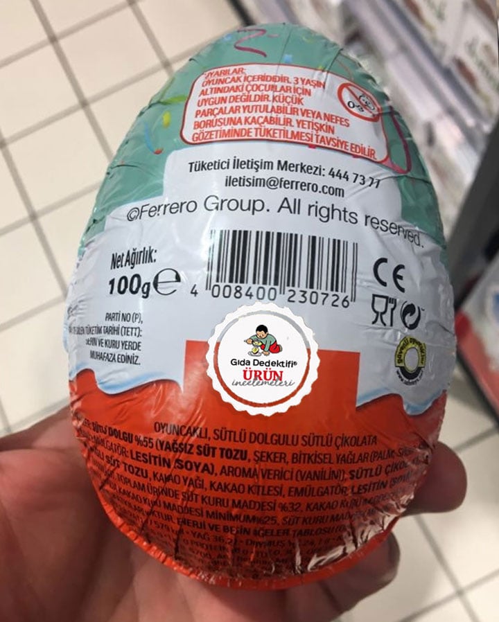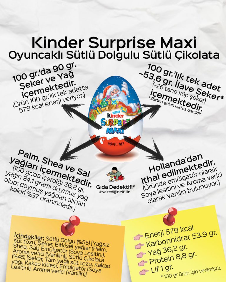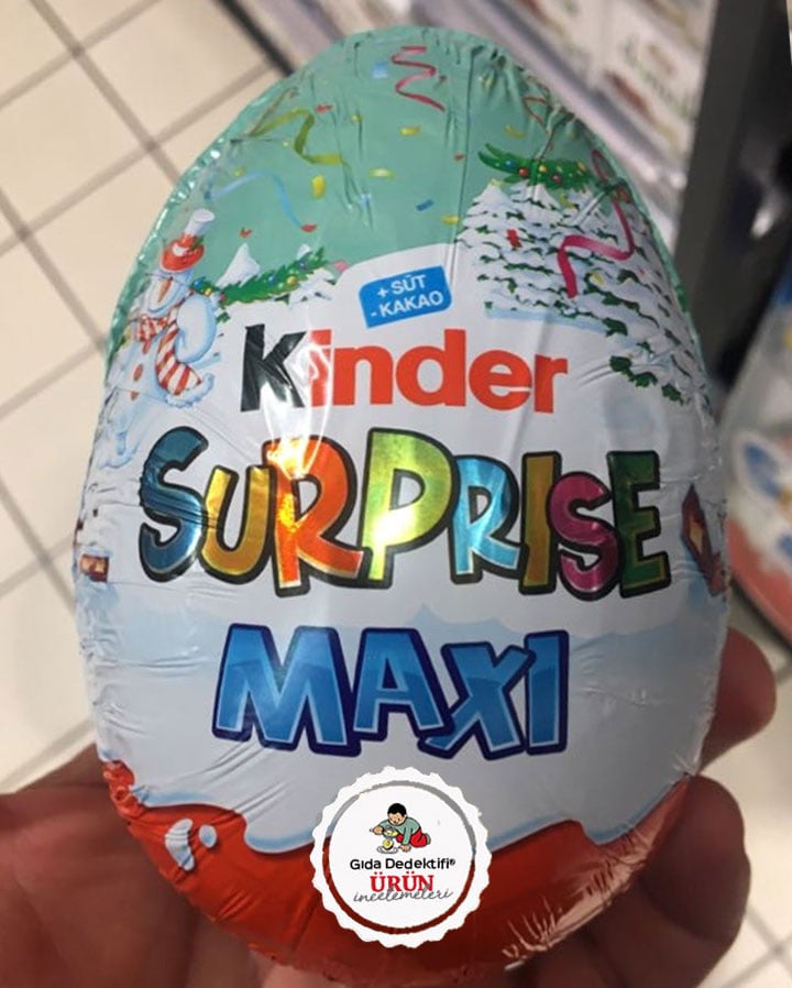 Yılbaşı döneminde metrelik çikolataların yanı sıra dev boyuttaki sürpriz yumurtaların da marketlerde dikkat çeken raflarda yer aldığını söyleyelim. Kinder Surprise Maxi ürünü 100 gr.’lık boyutuyla içinde oyuncak hediyesiyle Ticaret Bakanlığı’nın mevzuatına rağmen satışına devam ediyor. Bu ürünün geçmişten bugüne bu şekilde satıldığı için Ticaret Bakanlığı mevzuatından etkilenmediği de görüşler arasında yer alıyor. Söz konusu ürünün birazdan detaylarıyla bahsedeceğimiz şeker yükü ve yağ miktarı açısından çocuklarda tüketimi konusunda son derece dikkatli olunmasında fayda bulunuyor. Ürün Hollanda’dan ülkemize ithal ediliyor.