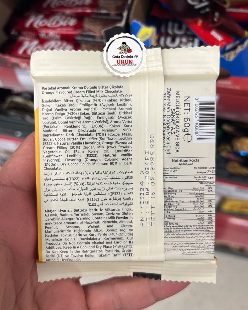 🔍İçindekiler: Bitter çikolata (%70) [Kakao kitlesi, Şeker, Kakao yağı, Emülgatör (Ayçiçek lesitini), Doğal vanilya aroma vericisi], Portakal aromalı kremalı dolgu (%30) [Şeker, Süttozu, Bitkisel yağ (Palm çekirdeği yağı), Emülgatör (Ayçiçek lesitini), Doğal vanilya aroma vericisi, Aroma verici (Portakal), Renklendirici (Karamel)]