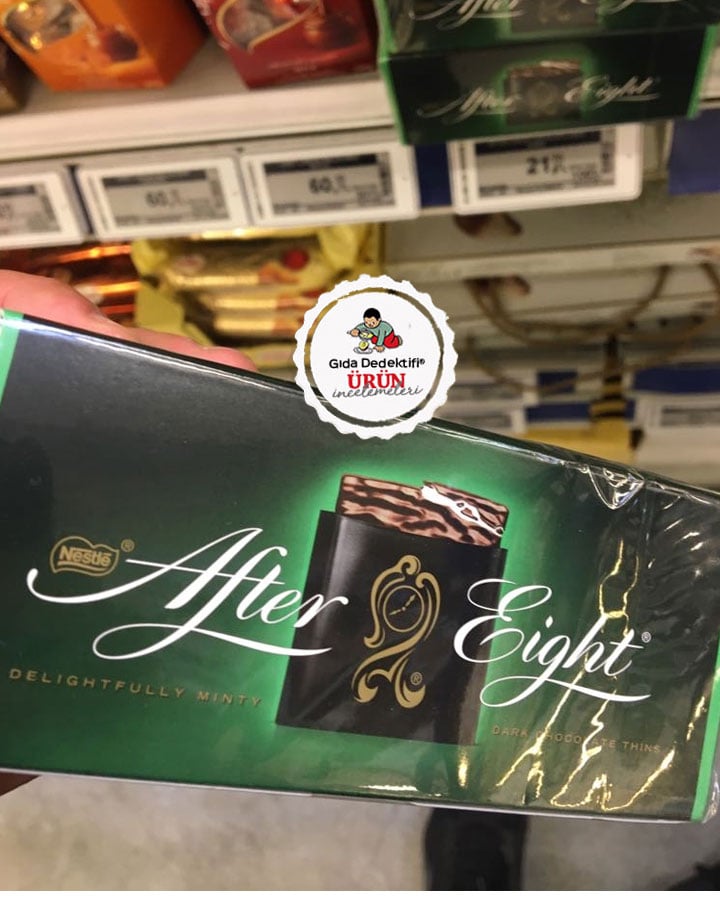Nestlé tarafından üretilen ve dünyanın birçok ülkesinde satışta olan After Eight Naneli Çikolatayı inceleyeceğiz. Ürün Almanya’dan ithal edilerek ülkemizde 200 gr.’lık paketlerde satılıyor. Ürünün tek adedi yaklaşık 8,3 gr. olup tek pakette 24 adet çikolata bulunmaktadır. Ürünün 2 adedi tek porsiyon olarak kabul edilmektedir. Biz de aşağıdaki besin değerleri tablosunda size iki adetten oluşan tek porsiyonun bilgilerini sunuyoruz.