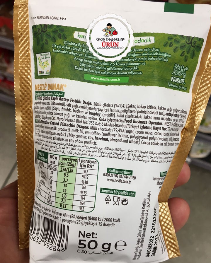 Nestlé markasıyla çok uzun yıllardır raflarda olan ve Antep fıstıklı çikolata denince akla gelen ilk ürünlerden olan Damak markasıyla raflarda yeni yer almaya başlayan Antep fıstıklı draje çikolatayı inceleyeceğiz. Ürün 50 gr.’lık paketlerde satılıyor.