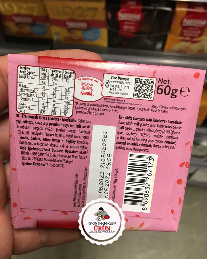 🔍İçindekiler: Şeker, Tam yağlı süttozu, Kakao yağı, Peyniraltı suyu tozu, Frambuazlı parçacık (%2,5) [Glikoz şurubu, Frambuaz (%37,5)], Emülgatör (Ayçiçek lesitini), Doğal aroma verici