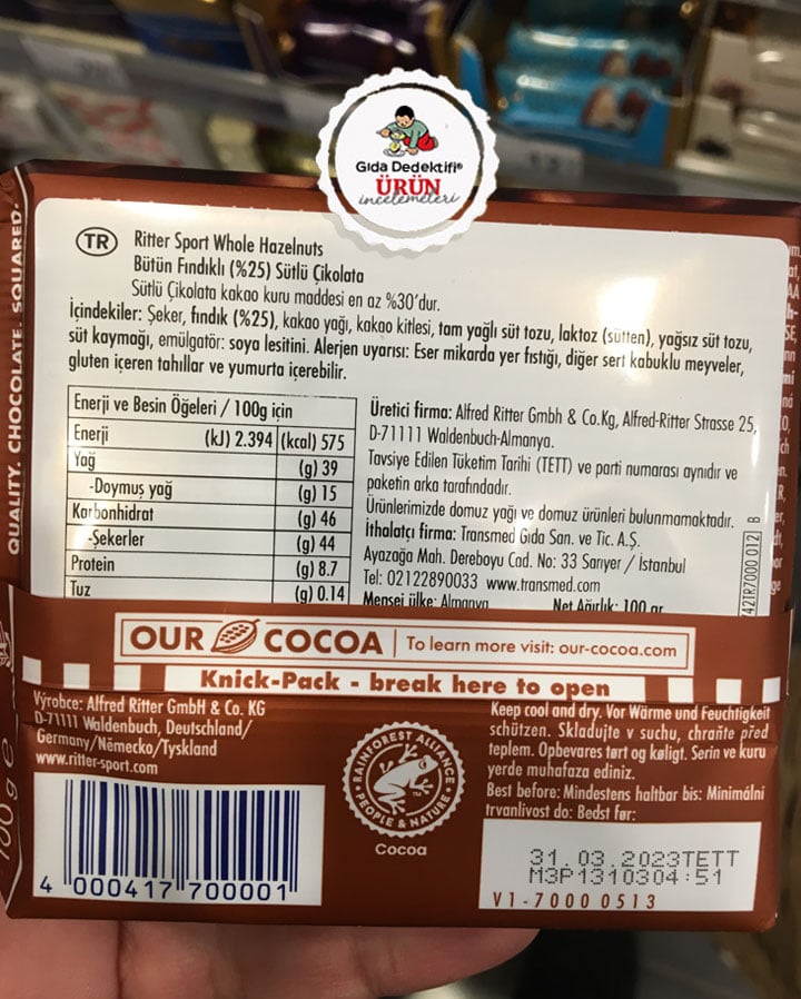 🔎Ritter Sport Whole Hazelnuts Bütün Fındıklı Sütlü Çikolata Besin Değerleri