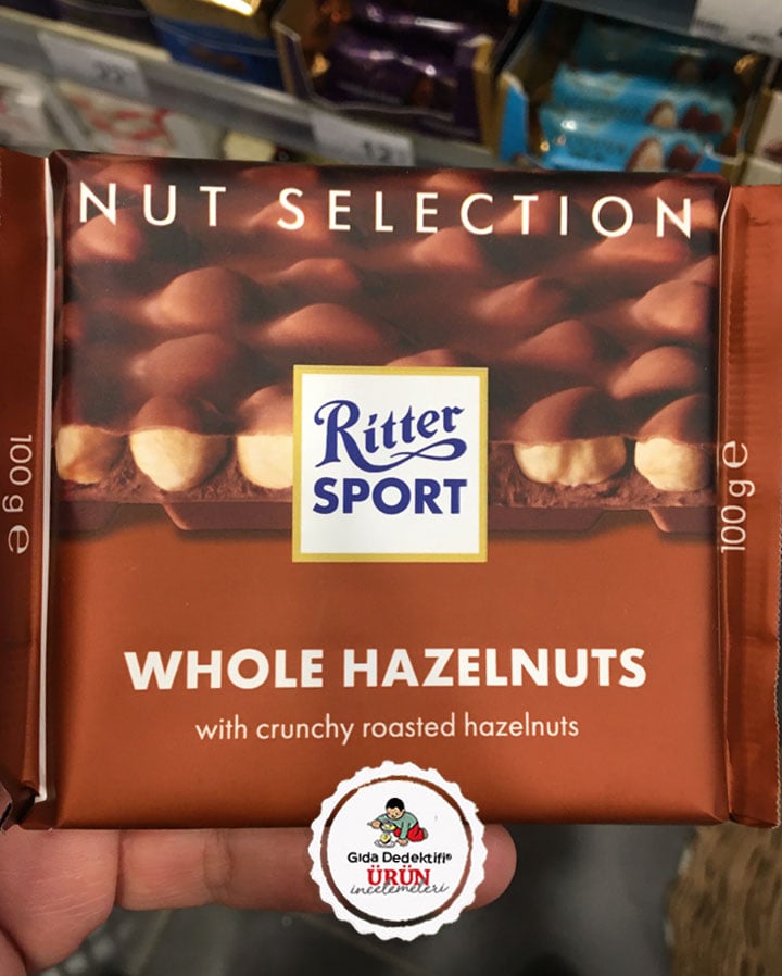 Avrupa marketlerinde çokça rastlanan ve ülkemizde de süpermarket reyonlarında gördüğümüz Ritter Sport markalı çikolataların Whole Hazelnut yani Bütün Fındıklı Sütlü Çikolata çeşidini inceleyeceğiz. Ürün Almanya’dan ülkemizde ithal edilerek 100 gr.’lık paketlerde satılıyor. Üründe %25 oranında bütün fındıklar yer alıyor. Bu da 100 gr.’lık tek pakette 25 gr. kavrulmuş fındık olduğunu gösteriyor. Üründe herhangi bir aroma verici bileşen yer almıyor.
