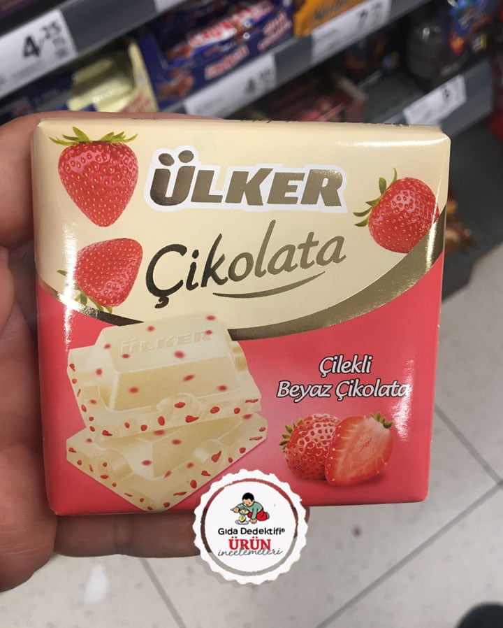 Şok marketlerde karşımıza çıkan Ülker markalı bir çikolatadan bahsedeceğiz; Çilekli Beyaz Çikolata. Ürün özellikle “ürünlerin tadına bakmaya” teşvik eden bazı sosyal medya hesaplarında gündeme getirilerek dolaylı reklam malzemesi haline getiriliyor. Her zamanki gibi ürünü sizler için bağımsız ve tarafsız bir tüketici gözüyle inceleyeceğiz. Ürün 60 gr.’lık ambalajlarda satılıyor. Ürün üzerinde 4 tane çilek ve bir de yarım çilek görseli yer alırken; yasal adı “Çilek parçacıklı beyaz çikolata” olan ürünün ambalajının ön yüzünde “Çilekli beyaz çikolata” ibaresi bulunuyor.