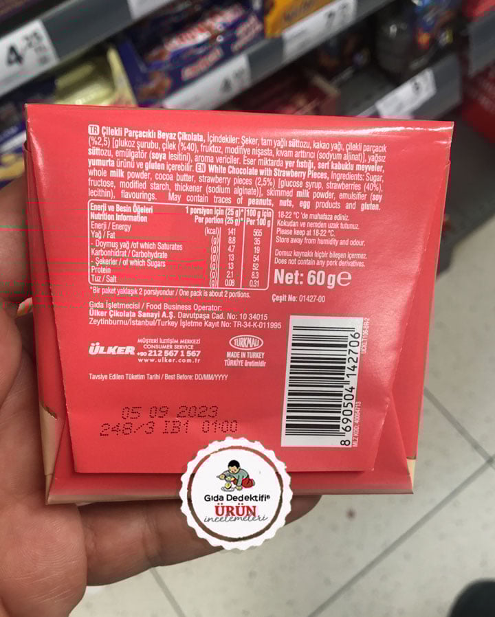 🔎İçindekiler: Şeker, Tam yağlı süttozu, Kakao yağı, Çilekli parçacık (%2,5) [Glikoz şurubu, Çilek (%40), Fruktoz, Modifiye nişasta, Kıvam arttırıcı (Sodyum Aljinat)], Yağsız süttozu, Emülgatör (Soya Lesitini), Aroma vericiler