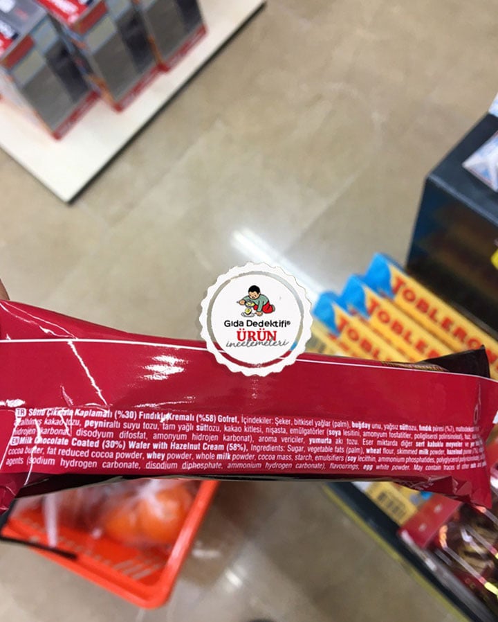 Üründe ayrıca Bitkisel yağ olarak Palm yağı bulunuyor. Buna göre ürün 100 gr.’da 26 gr. yağ içerirken, bunun 12 gramı doymuş yağ olarak beyan edilmektedir. Bu da 45 gr.’lık tek adette 11,7 gr. yağ içerdiğini gösteriyor. Bu haliyle üründen alınan kalorinin %21,2’sinin doymuş yağdan geldiğini hesaplıyoruz. Üründe ayrıca fındıktan gelen ve az oranda da olsa tam yağlı süttozundan kaynaklı yağlar da bu orana dahil edilmektedir. Üründe bu temel bileşenlerin yanı sıra; %7 oranında fındık püresi, yağı azaltılmış kakao tozu, peyniraltı suyu tozu, tam yağlı süttozu ve kakao kitlesi yer alıyor. Üründe ayrıca emülgatörler ve kabartıcılar yer alıyor. Ürün emülgatör olarak soya lesitini içeriyor. Üründe ayrıca niteliği ve içeriği bilinmeyen aroma vericiler içermektedir. Üründe son sırada bindelik oranlarda da olsa yumurta akı tozu olduğunu da özellikle alerjen uyarı olarak belirtelim.