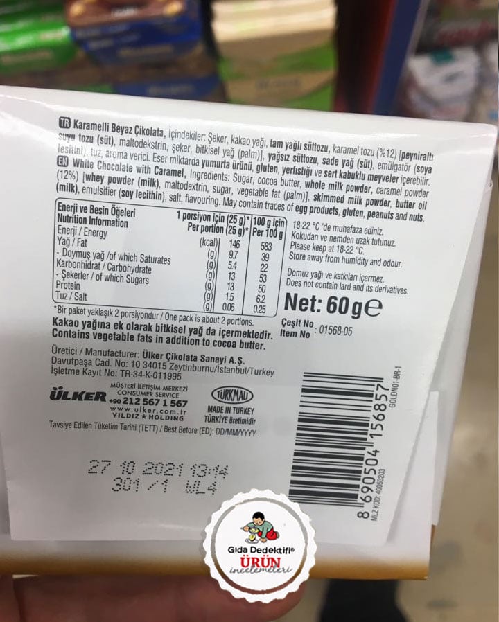Diğer yandan ürün 100 gr.’da 50 gr. Şeker içeriyor. Bu şeker yüksek oranda sofra şekerinden gelirken; üründe nişasta bazlı maltodesktrinin yanı sıra; süttozundan gelen laktoz da bulunuyor. Ürün bu haliyle 60 gr.’lık tek adette yaklaşık 30 gr. ilave şeker içeriyor. Bu da tek pakette yaklaşık 15 tane küp şeker demek oluyor. Üründeki maltodekstrin ve laktoz oranının sofra şekeri oranına göre çok daha düşük olduğunu söyleyelim. Üründe ayrıca %12 oranında karamel tozu bulunuyor. Ürün beyaz çikolataya karamel tozu ilavesiyle “altın” diye satılsa da; ürün içeriğindeki kalori, yağ ve şeker miktarı ürünün asıl değerini gözler önüne seriyor. Üründe emülgatör olarak sade yağ ve içeriğinii bilmediğimiz aroma verici bulunduğunu söyleyelim.