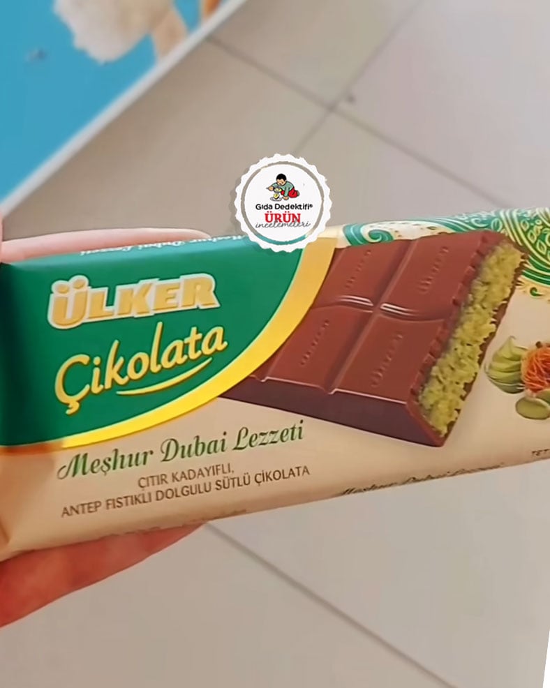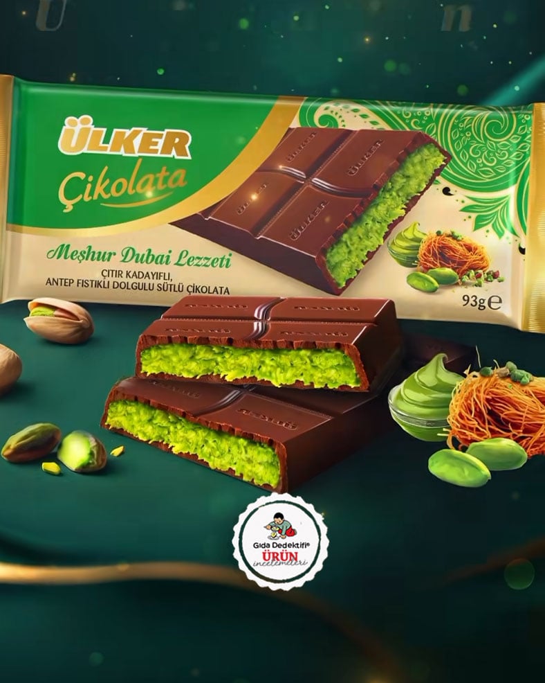 Dubai asıllı Sarah Hamouda tarafından 2024 yılının ilk aylarında denenen ve Fix Dessert Chocolatier markası tarafından üretilmeye başlanan kadayıflı çikolatalar sosyal medyanın da etkisiyle önceki aylarda en çok konuşulan ürünler arasına girmeye başladı. Bu durumdan istifade etmeye çalışan Ülker firması da Godiva’yı ürettiği Silivri’deki tesislerinde bu kez “Meşhur Dubai Lezzeti” adıyla kadayıflı ve Antep fıstıklı sütlü çikolata üretti. 93 gr’lık ambalajlarda satışa sunulan ürünün ambalajında çikolata içinde yoğun kadayıf ve fazla yeşile boyanmış Antep fıstığı ise ilk bakışta dikkat çekti.