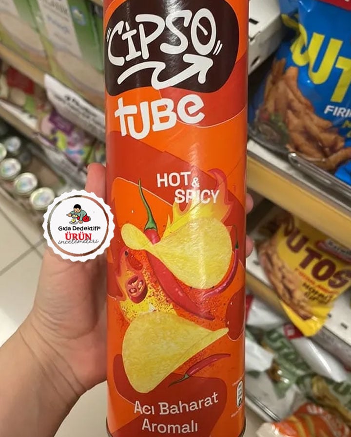 Market raflarında atıştırmalık reyonunda Pringles benzeri formatıyla dikkat çeken yerli üretim cips ürünlerinden birini inceleyeceğiz: Cipso Tube Hot & Spicy. Yasal ismiyle "Acı Baharat Aromalı Patates Çerezi" ibaresiyle satışa sunulan ürün ambalajında biber görselleri ve "Hot & Spicy" ifadesiyle yoğun bir acılık ve baharat algısı oluşturulmuş. Ürün Doğuş Çay firması tarafından Giresun'daki Organize Sanayi Bölgesi'nde bulunan üretim tesislerinde üretiliyor. Ürün 90 gr'lık kutularda satışa sunuluyor.