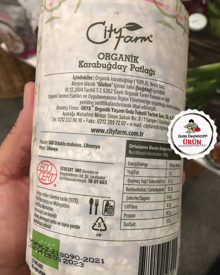 Bazı takipçilerimiz tarafından sorulan ve içeriğinde herhangi bir katkı maddesi, bitkisel yağ ya da aroma verici bileşen bulunmayan City Farm markalı Organik Karabuğday Patlağı ürününü inceleyeceğiz. Ürün 100 gr.’lık paketlerde satılırken, üründe 12 adet karabuğday patlağı bulunuyor ve buna göre ürünün tek adedi yaklaşık 9 grama denk geliyor. Litvanya’da üretilerek ülkemize ithal edilen ürünün organik sertifikasyon süreçleri ve denetimi ise EcoCert firması tarafından yapılıyor. Ürünün Litvanya’da “Organik Karabuğday Cipsi” olarak satıldığı görülürken, içeriği açısından bir fark olmamasına rağmen ülkemizde “Organik Karabuğday Patlağı” olarak satıldığı anlaşılıyor.