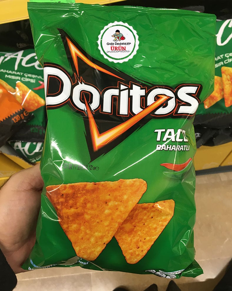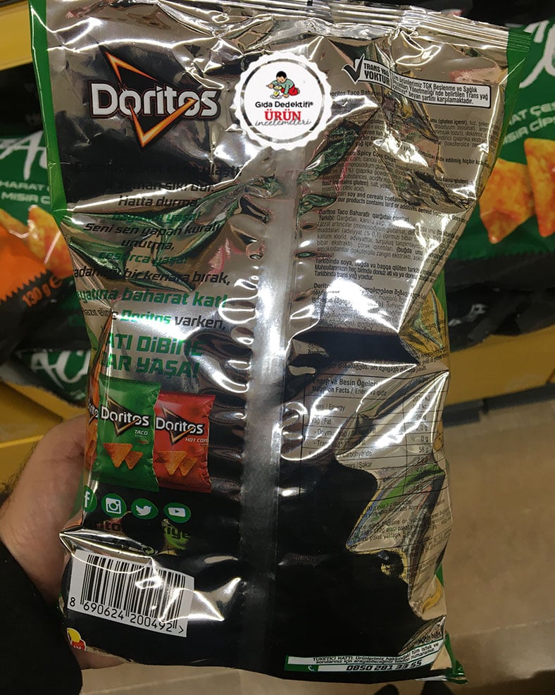 ABD’li Frito Lay firması tarafından Türkiye’de üretilerek satışa sunulan Doritos Taco Baharatlı Mısır Cipsi ürününü inceleyeceğiz. Ürünün farklı boylarda market reyonlarında yer aldığını ve bu incelemeyi 218 gr’lık standart paket üzerinden yaptığımızı belirtelim. Daha çok gençlere yönelik satışa sunulan ürün ambalajında ise ürünle hiçbir ilgisi olmayan ifadeler yer alıyor. Ambalajın arkasında “Hayatı dibine kadar yaşa”, “Cesurca yaşa”, “Hayatını yaşa” gibi ibareler dikkat çekiyor. Ürün içeriğine baktığımızda ise ürünü tüketmek için gerçekten cesarete ihtiyacımız olduğunu anlıyoruz.