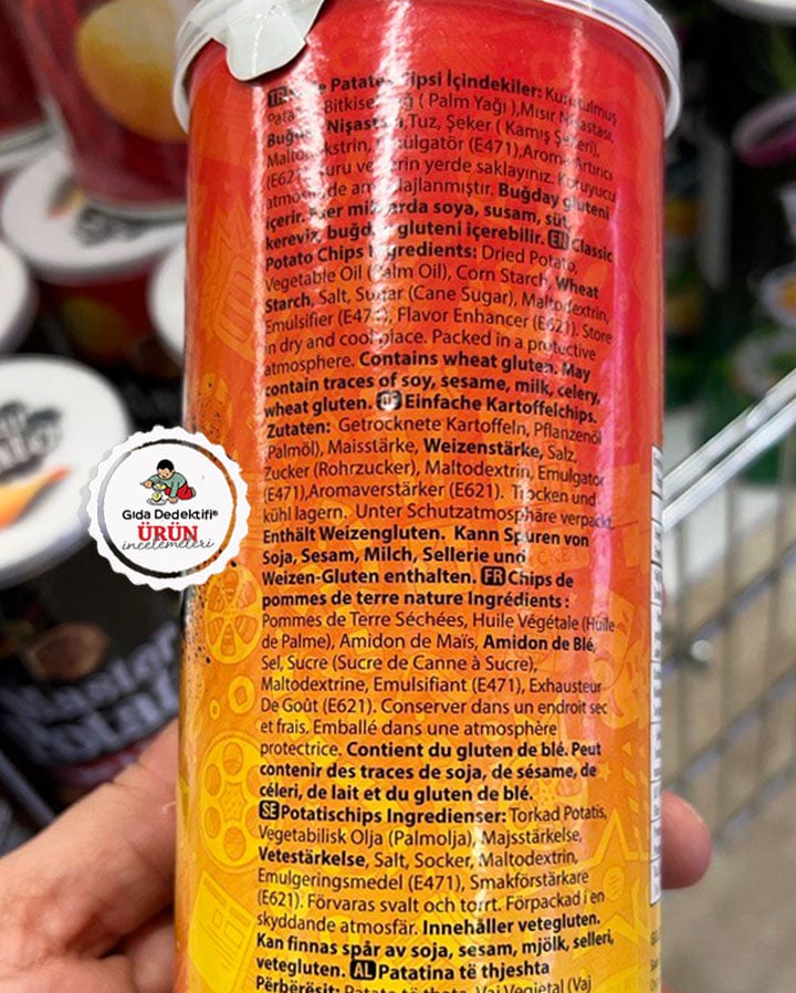 Ürün içeriğine baktığımızda ilk sırada kurutulmuş patates olduğunu görüyoruz. Fakat ürüne ismini veren ve ilk sırada olan patatesin oranı tüketiciye beyan edilmiyor. Yani bu patates cipsinde ne kadar patates olduğu bilinmiyor. Diğer yandan üründe patatesin ardından palm yağı, mısır nişastası ve tuz olduğu görülüyor. Üründe ayrıca sofra şekeri ile nişasta bazlı bir tür şeker olan maltodekstrin bulunuyor.Ürün ayrıca emülgatör ve aroma arttırıcı katkı maddeleri içeriyor. Bu katkı maddelerinin sadece E kodlarının yazılarak, tüketiciye tam isimlerinin beyan edilmediğini söyleyelim. Bu haliyle üründe emülgatör olarak yağ asitlerinin mono ve digliseritleri ile aroma arttırıcı olarak Monosodyum Glutamat bulunuyor. Üründeki emülgatörün bitkisel kaynaklı olup olmadığı ise beyan edilmiyor. Üründe ayrıca domuz yağı veya domuz kaynaklı bileşen olmadığına dair herhangi bir uyarı da yer almıyor.