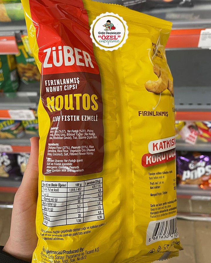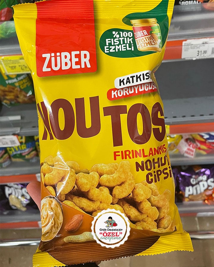Züber markasıyla satışa sunulan fırınlanmış nohut cipsi Noutos’un fıstık ezmeli çeşidini inceleyeceğiz. İçeriğinde %100 fıstıklı Züber fıstık ezmesi bulunan ve palm yağı veya türevlerini içermeyen, aroma verici veya aroma arttırıcı katkı maddeleri yer almayan ürün 55 g’lık paketlerde satılıyor. Ürün Alterna Gıda’ya ait İstanbul’daki tesislerde üretiliyor.