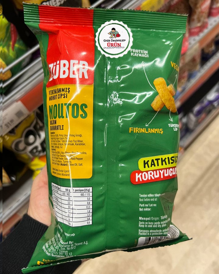 Asıl cesaret paketin arkasını gösterebilmekte diyerek yeni reklam filmiyle herkese gerçekleri, cesaretle haykıran; yeni nesil atıştırmalık ürünlerinin lider markası Züber tarafından üretilen Noutos fırınlanmış nohut cipslerinin kajun bahartlı çeşidini inceleyeceğiz. Ürün 55 g’lık paketlerde satılıyor ve İstanbul’daki Alterna Gıda tesislerinde üretiliyor.