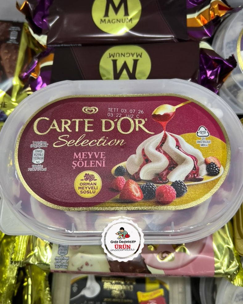 Unilever firması tarafından ülkemizde üretilerek dondurma görünümünde satışa sunulan bitkisel yağlı sütlü buz ürünlerinden birini inceleyeceğiz: Carte D’or Selection Meyve Şöleni. Ürün 800 ml’lik ambalajında “orman meyveli soslu” ifadesi ve orman meyve görselleriyle birlikte satışa sunuluyor. Dondurma değil, yenilebilir buz olarak kategorilendirilen ürün bu haliyle dondurma tebliğine göre değil; yenilebilir buz tebliğine göre üretilmektedir. Ürünün Algida’ya ait Çorlu ve Konya fabrikalarında üretilerek satışa sunulduğu anlaşılmaktadır.