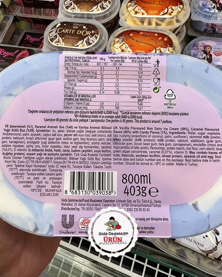 Ürün bu temel bileşenlerin yanında yağsız süttozu, peynir altı suyu tozu ve süt proteini gibi süt ürünleri içerirken, ürünü dondurma yapacak olan “süt yağı” yani krema bulunmuyor. “Kalsiyum kaynağı” olarak beyan edilen üründe kısmen sütten gelen kalsiyumun yanında kalsiyum ialvesi bulunuyor. Ürün ayrıca kıvam arttırıcılar ve emülgatör katkı maddeleri ile içeriği bilinmeyen yapay aroma vericiler içeriyor. Üründe ayrıca patates nişastası, pirinç unu, mısır nişastası ve mavi-yeşil alg konsantresi yer alıyor. Ürün %0,01 yani onbinde 1 oranında karamel yanında karamel aroması da içeriyor. Ürün bu haliyle 60 gr’lık tek porsiyonda 94 kcal enerji veriyor. Ürünün tek porsiyonunda 13 gr şeker ve 3,8 gr yağın yanında kısmen sütten gelen 1,4 gr protein bulunuyor. Ürünün tek porsiyonunda ayrıca 2,3 mcg D vitamini ile 165 mg kalsiyum yer alıyor. Buna göre ürünün tek porsiyonundan alınan D vitamini günlük ihtiyacın %46’sını karşılamaya yetiyor. #NeYediğiniziBilin