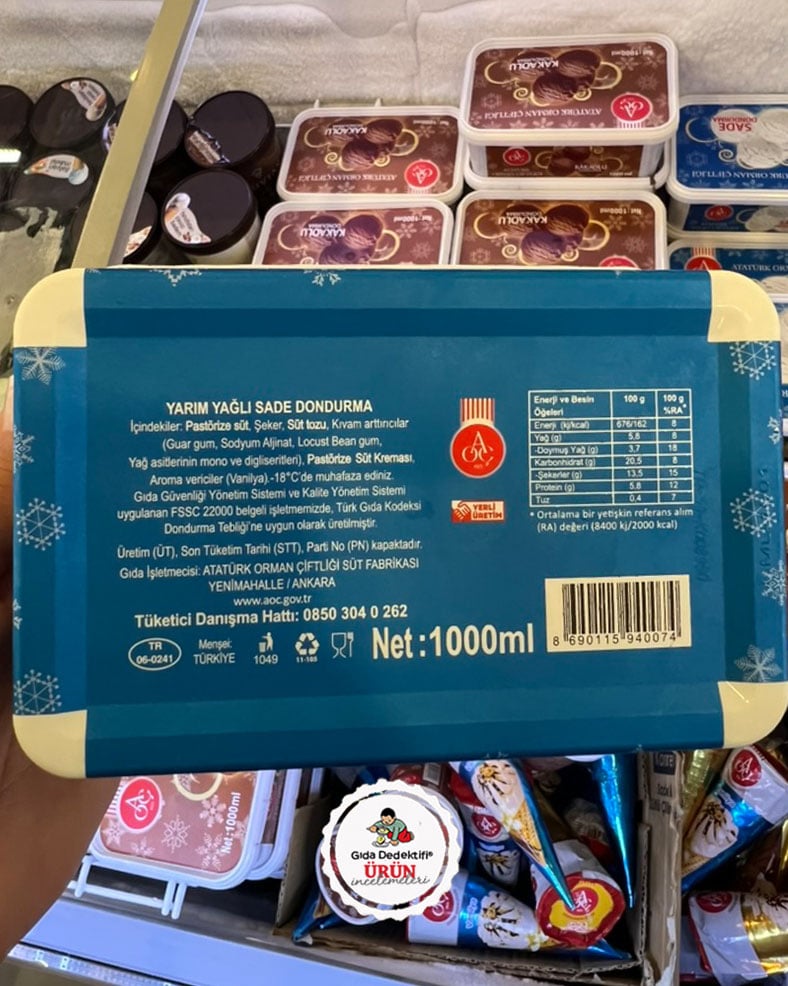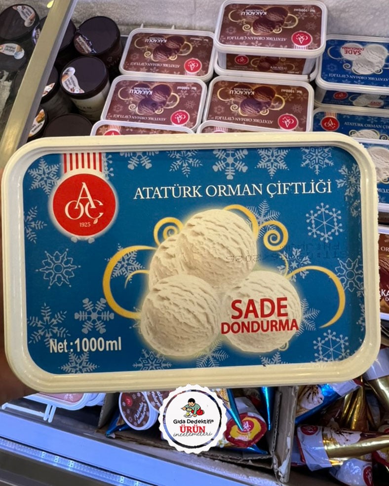 Atatürk Orman Çiftliği Genel Müdürlüğü tarafından son dönemde sosyal medyada çeşitli iddialarla gündeme gelen AOÇ markasıyla satışa sunulan sade dondurma ürününü inceleyeceğiz. Ürün 1000 ml’lik kutularda satışa sunuluyor ve Ankara’nın Yenişehir ilçesindeki Atatürk Orman Çiftliği Süt Fabrikası’nda üretiliyor.