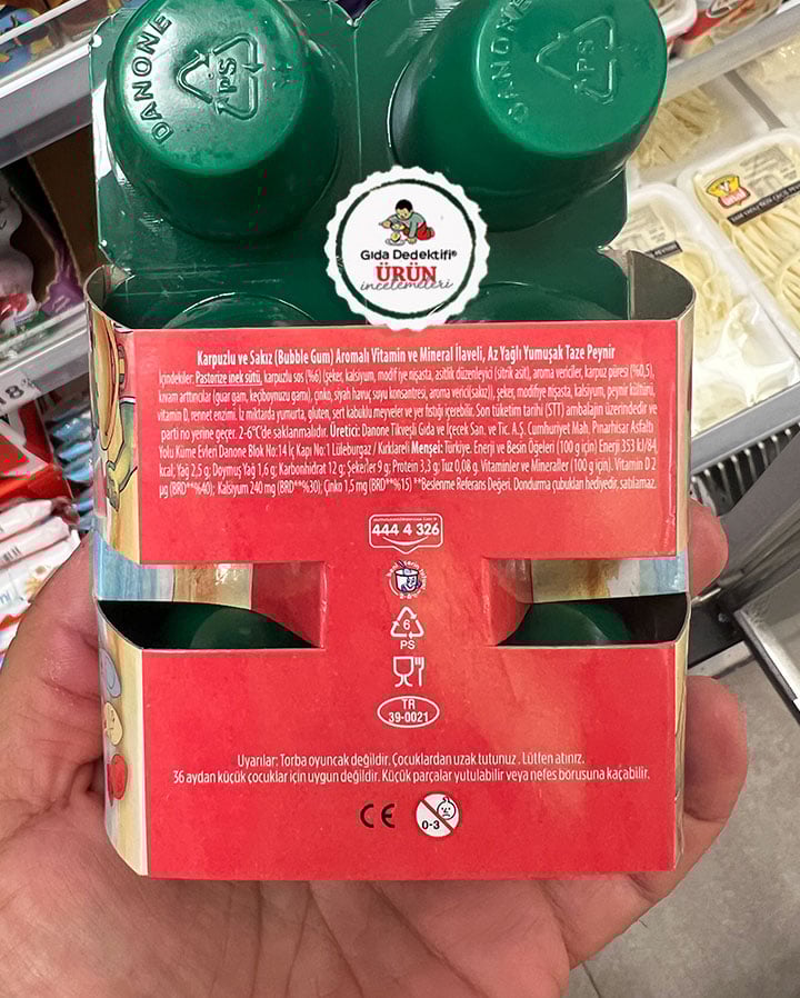 Yaz aylarında reyonlara giren ve halen satışına devam edilen Danino Dondurma çubuğu hediyeli karpuzlu ve sakız aromalı peynir ürününü inceleyeceğiz. 6’lı paketlerde tek adedi 40 gr’lık kutularda satışa sunulan bu ürüne ne kadar peynir denmeli orası tartışılır fakat, ürünün özellikle çocuklara yönelik ambalajlarla pazarlanması ve “kalsiyum”, “D vitamini” ve “Çinko” vurgusuyla satışı üzerine dikkat çekmek istiyoruz. İlk olarak ürünün Danone Tikveşli firması tarafından Lüleburgaz’daki tesislerde üretildiğini söyleyelim.