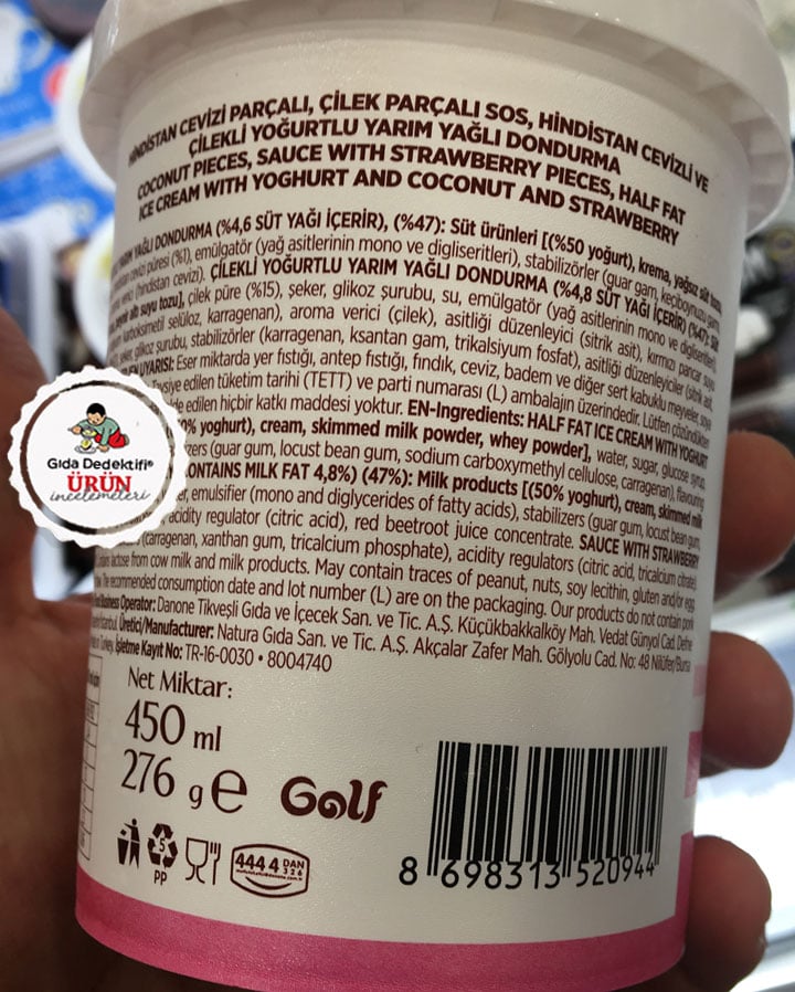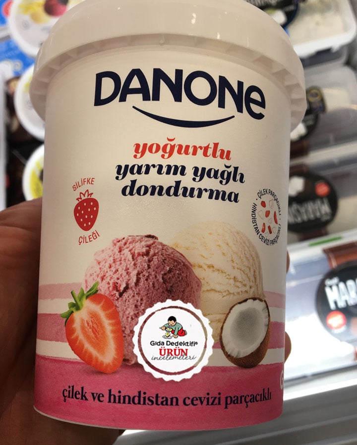 Daha çok yoğurt ve süt ürünleriyle bilinen Danone markasıyla dondurma reyonlarında satılmaya başlayan bir ürünü inceleyeceğiz; Danone Çilek ve Hindistan Cevizi Parçacıklı Yoğurtlu Yarım Yağlı Dondurma. Ürün 450 ml.’lik kutularda satılıyor. Ürün Danone markasıyla satılsa da, Danone Tikveşli tarafından değil, fason üretim modeliyle Golf markasıyla bilinen Natura Gıda tarafından üretiliyor. Ürün etiketinde de Golf markasının logosunun yanı sıra üretici olarak Natura Gıda San. ve Tic. A.Ş. unvanı görülüyor.