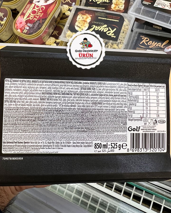 Natura Gıda tarafından üretilerek satışa sunulan Golf Royal markalı yarım yağlı dondurma ürünlerinden Gourmet serisinden Karadut ve Şeftali soslu ve Karadut ve Şeftalili sorbe içerikli, kavun aromalı yarım yağlı dondurma ürününü inceleyeceğiz. Ürün 525 gr’lık paketlerde satışa sunuluyor ve tek porsiyonu 60 gr olarak hesaplanıyor. Ürün ambalajında “Bursa şeftalisi” ifadesinin yanında “Bursa’nın sulu ve hoş kokulu şeftalisinin karadut ve kavun ile birleşen ferahlığı” ifadesi yer alıyor fakat üründe kavun bulunmuyor.