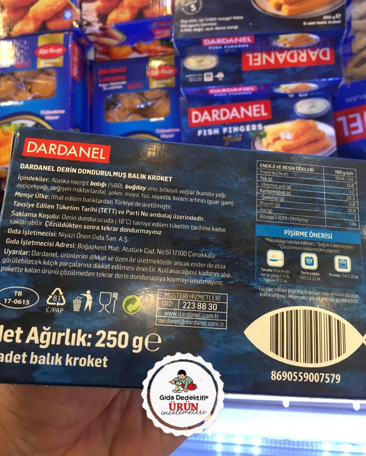 Marketlerdeki dondurulmuş reyonlarda dikkatimizi çeken balık ürünlerini incelemeye devam ediyoruz. Şimdi de Dardanel markalı Fish Fingers Gold ürününü inceleyeceğiz. Ürün 250 gr.’lık paketlerde satılıyor ve içeriğinde her biri 31,25 gr.’lık 8 adet balık kroket yer alıyor. Ambalaj üzerinde “Dışı kıtır, içi %100 mezgit fileto”, “Koruyucu içermez”, “Çiftlik değil, açık deniz balığı” ifadeleri yer alıyor. Ürünün pişirme önerisinde mikrodalga tavsiye edilmezken, tavada, derin yağda ya da fırında pişirilerek servis edilebilceği belirtiliyor.