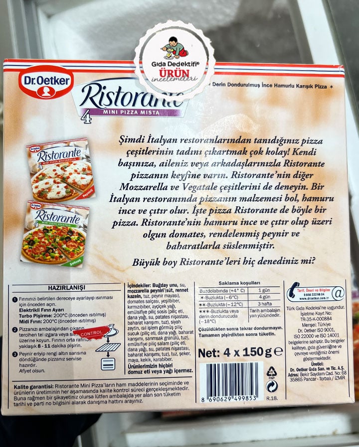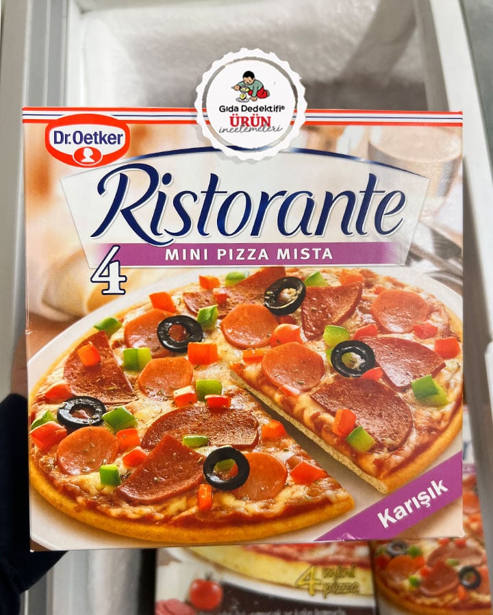 Marketlerin dondurulmuş ürün reyonlarında uzun yıllardır yer alan ürünlerden olan pizzaları incelemeye başlıyoruz. İlk olarak Dr Oetker markasıyla satışa sunulan Ristorante Mini Pizza Mista ürününü inceleyeceğiz. Ürünün tek paketinde tek adedi 150 gr’lık dört adet pizza bulunuyor. Ürünün ambalajında ise “İtalyan restoranlarından tanıdığınız pizza çeşitlerinin tadını çıkarın” ifadeleri yer alıyor.