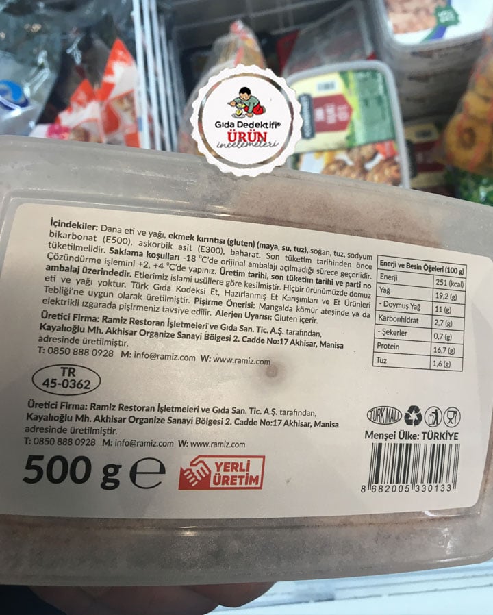 🔎İçindekiler: Dana eti ve yağı, Ekmek kırıntısı [Maya, Su, Tuz], Soğan, Tuz, Sodyum bikarbonat, Askorbik asit