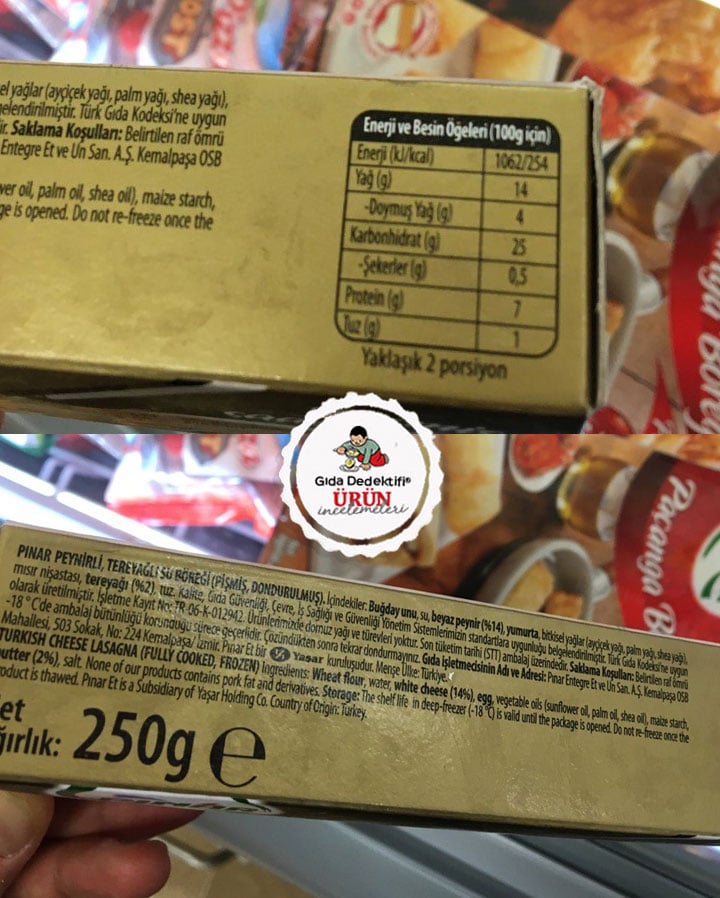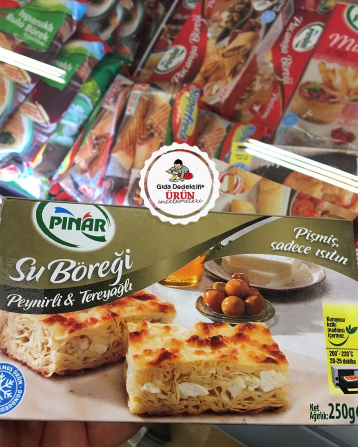 Daha önce incelemediğimiz fakat geleneksel mutfağımızda çokça tüketilen su böreğini Pınar markalı ambalajlı ürün üzerinden inceleyeceğiz. İlk olarak üründe koruyucu, aroma verici veya herhangi bir ilave katkı maddesi olmadığını belirtelim. Ürün 250 gr.’lık ambalajlarda dondurulmuş olarak satılıyor. 125 gr. ürün tek porsiyon kabul ediliyor.