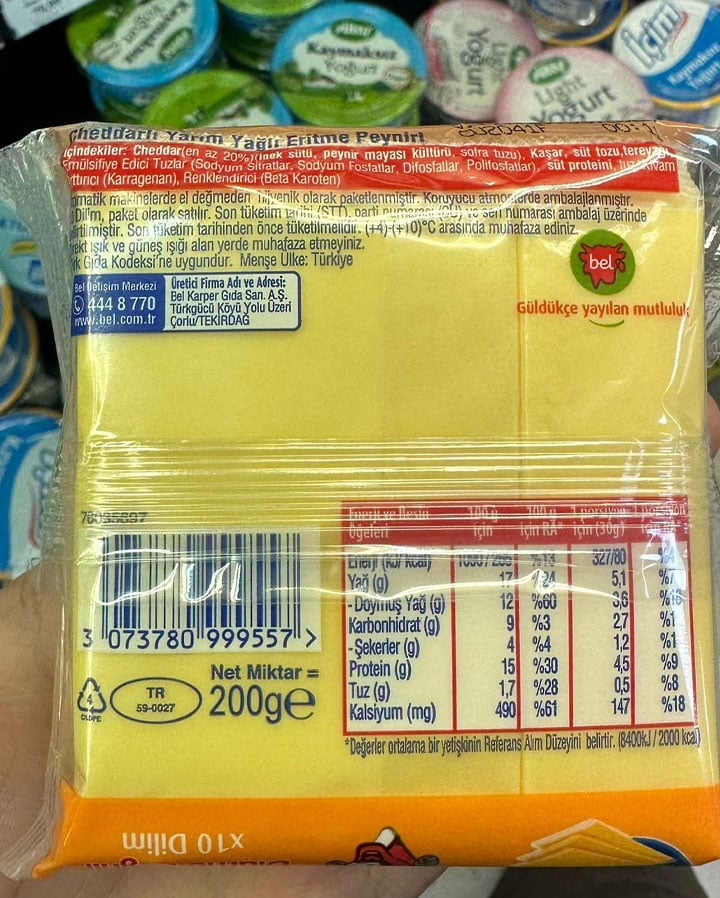 🔍İçindekiler: Cheddar (%20) [İnek sütü, Peynir mayası kültürü, Sofra tuzu), Kaşar, Süt tozu, Tereyağı, Emülsifiye edici tuzlar (Sodyum sitratlar, Sodyum fosfatlar, Difosfatlar, Polifosfatlar), Süt proteini, Tuz, Kıvam arttırıcı (Karragenan), Renklendirici (Beta Karoten)