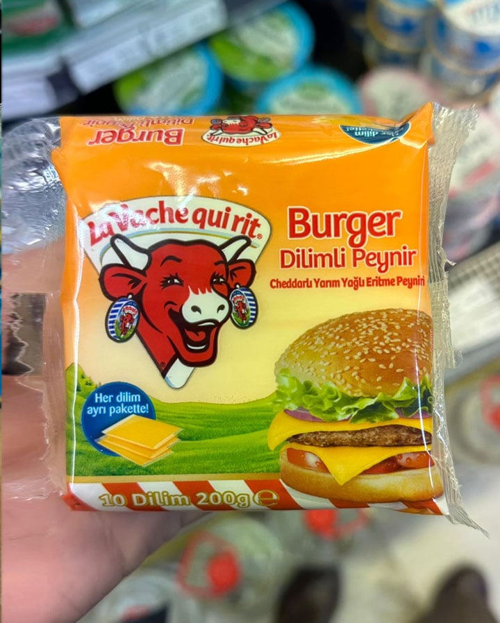 Genellikle üç peynirleriyle bilinen ve Türkiye’de Karper firmasını satın aldıktan sonra Tekirdağ’daki tesislerde üretim yapmaya başlayan Lavache Qui Rİt markalı Dilimli Burger Peyniri ürününü inceleyeceğiz. 200 gr.’lık paketlerde satılan ürünün ayrıca 20 gr.’lık dilimler halinde tek tek paketlendiğini söyleyelim. Ürün aslında ambalajın ön yüzünde de beyan edildiği gibi “yarım yağlı eritme peyniri” kategorisindedir.
