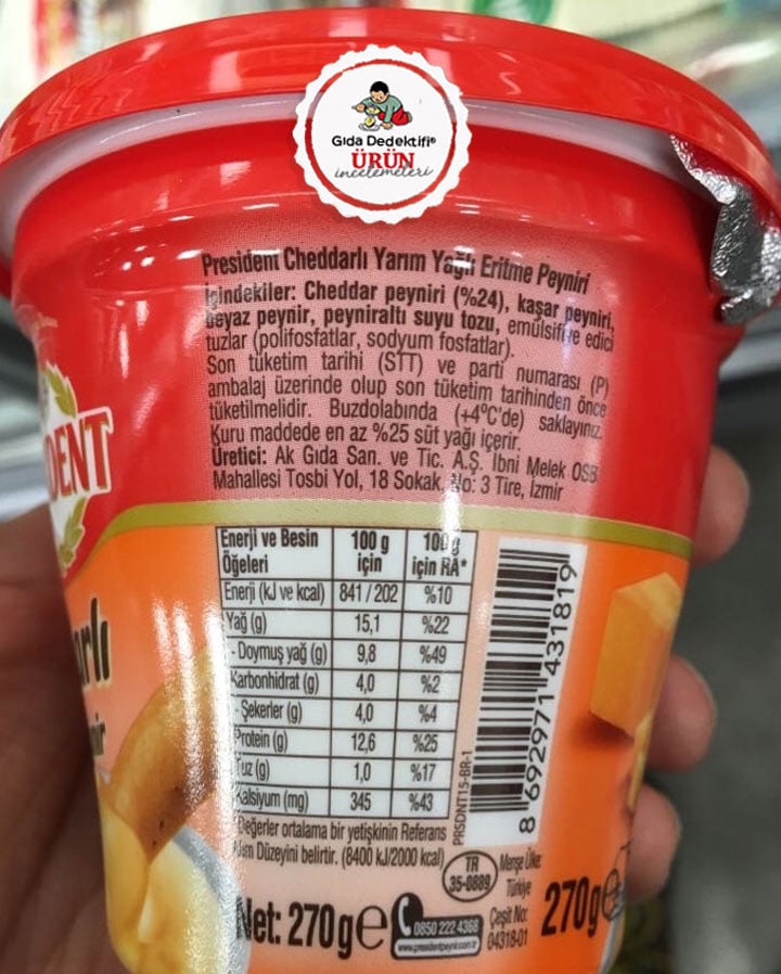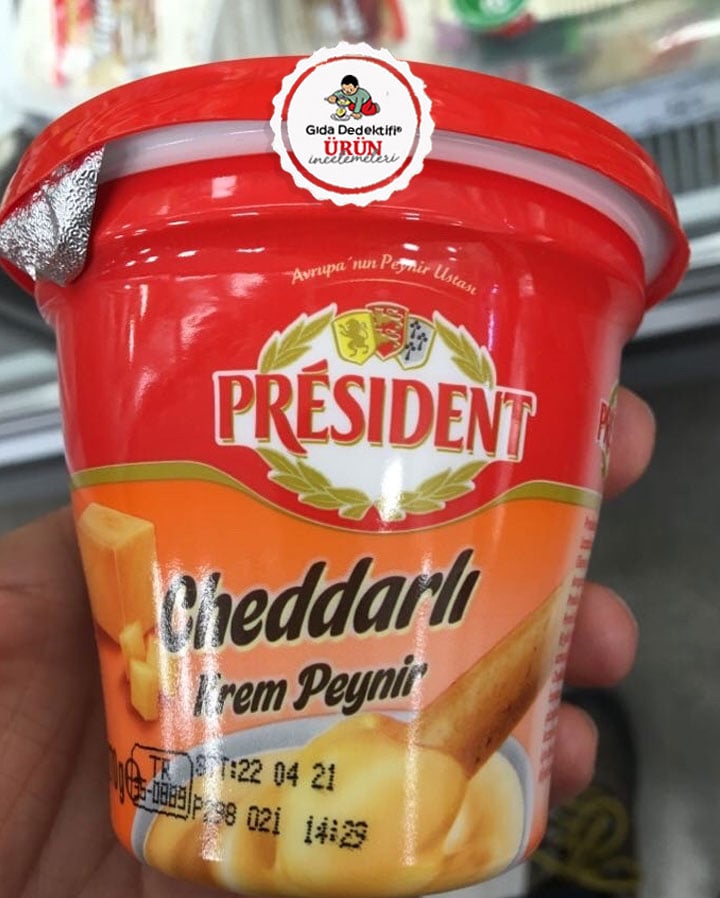 Piyasada pek çok farklı isimde ve çeşitte alternatifine rastladığımız eritme peynirlerinden President Cheddarlı Krem Peyniri inceleyeceğiz. President, Fransa’da bilinen ve Türkiye’ye yine Fransız sermayeli Lactalis firmasına bağlı faaliyet gösteren Ak Gıda tarafından getirilen bir marka. İnceleyeceğiz ürün ise Türkiye menşeli bir ürün olup, Ak Gıda’nın İzmir fabrikasında üretildiği görülüyor. Aynı fabrikada İçim markalı ürünler de üretiliyor. Ürün 270 gr.’lık paketlerde satılıyor. Ürün yasal olarak yarım yağlı eritme peynir kategorisinde olmasına rağmen, ambalajın ön yüzünde eritme peyniri ifadesi yerine “krem peynir” ibaresi yer alıyor.
