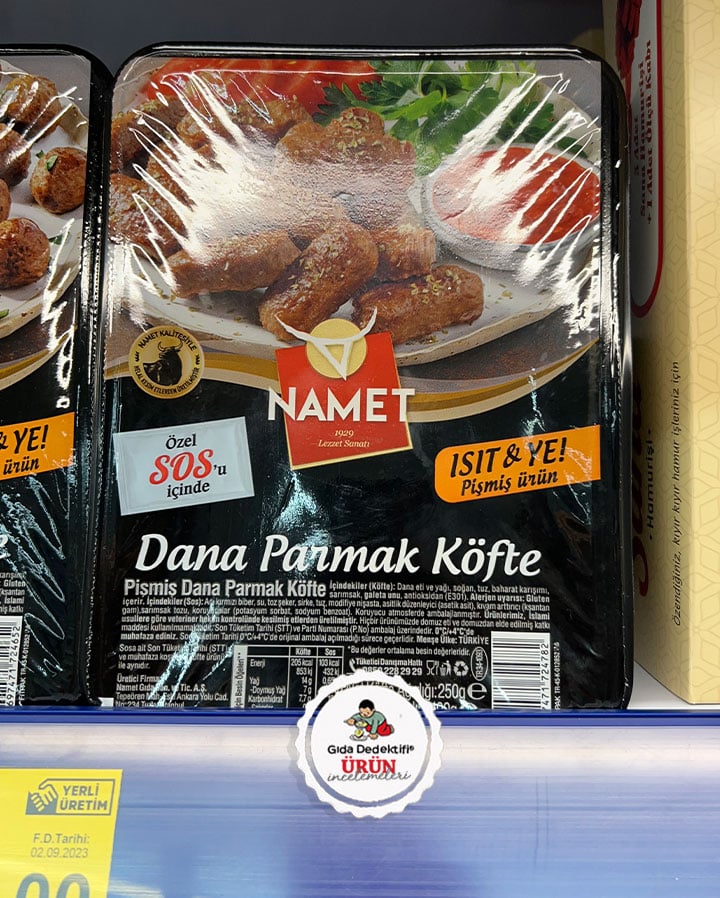Namet markasıyla sosuyla birlikte satışa sunulan Dana parmak köfte ürününü inceleyeceğiz. Ürün ambalajındaki “özel sos” içeriğiyle ve “Isıt & ye! Pişmiş ürün” ifadesiyle dikkat çekiyor. 350 gr’lık paketlerde satışa sunulan üründe 250 gr köfte ve 100 gr sos bulunuyor. Ürün İstanbul Tepeören’deki Namet Gıda tesislerine üretiliyor.