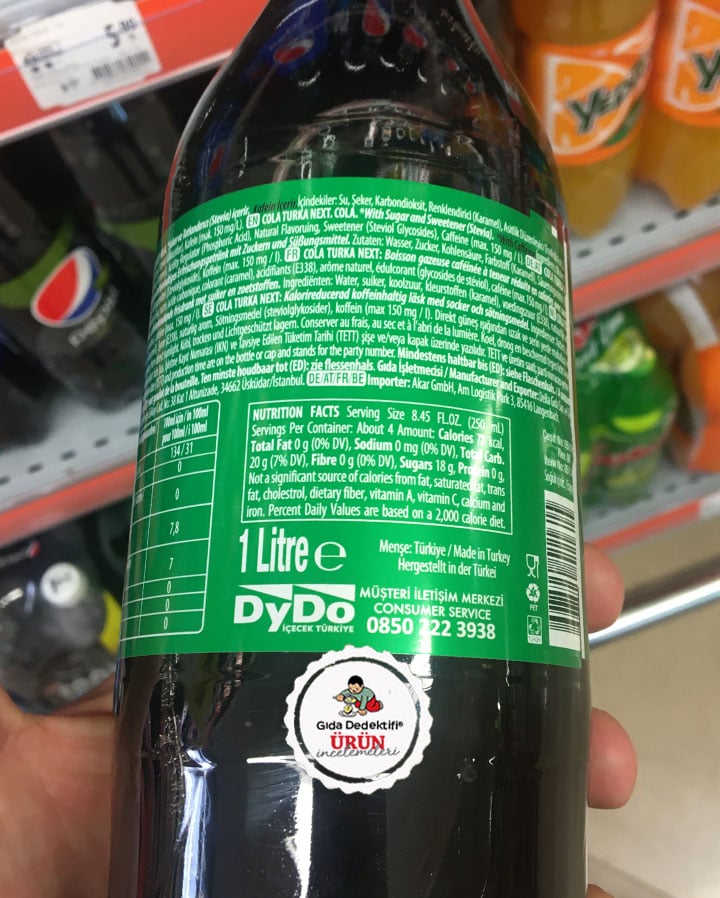 Üründe yer alan sofra şekerine ilave olarak ambalajındaki yeşil rengi de borçlu olduğumuz Steviol Glikozitler yani Stevya olduğunu anlıyoruz. Ürün bu haliyle 100 ml'de 7 gr. şeker içeriyor - ki bu da 250 ml'lik tek bardakta 17,5 gr. yani yaklaşık 9 tane küp şekere denk geliyor. Sadece tek bardakta yaklaşık 9 tane küp şeker yer alsa da, Stevya'nın varlığıyla muhtemelen daha şekerli bir tat alıyorsunuz. Ürünün Coca Cola ile kıyaslandığında yaklaşık %60 oranında daha az şekere sahip olduğunu söylemek mümkün. Öyle ki, Coca Cola 250 ml'lik tek bardakta 28 gr. ilave şeker içerirken, ayrıca nişasta bazlı şeker türü olan glikoz-fruktoz şurubu da içerebiliyor.