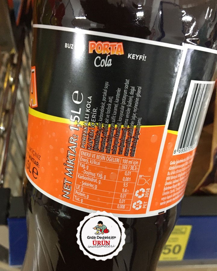 Geçen hafta Bim market reyonlarına güncel ürün olarak gelen bir ürünü inceleyeceğiz; Porta Kola. Porta markasıyla satışta olan ürün Bim A.Ş. tarafından Kristal Kola A.Ş.’nin Balıkesir fabrikasında fason olarak ürettiriliyor. Ürün 1,5 litrelik şişelerde satılıyor. Ürün içeriğinde sofra şekeri dışında nişasta bazlı şeker veya tatlandırıcı bulunmuyor fakat birçok farklı katkı maddesi olduğu dikkat çekiyor.