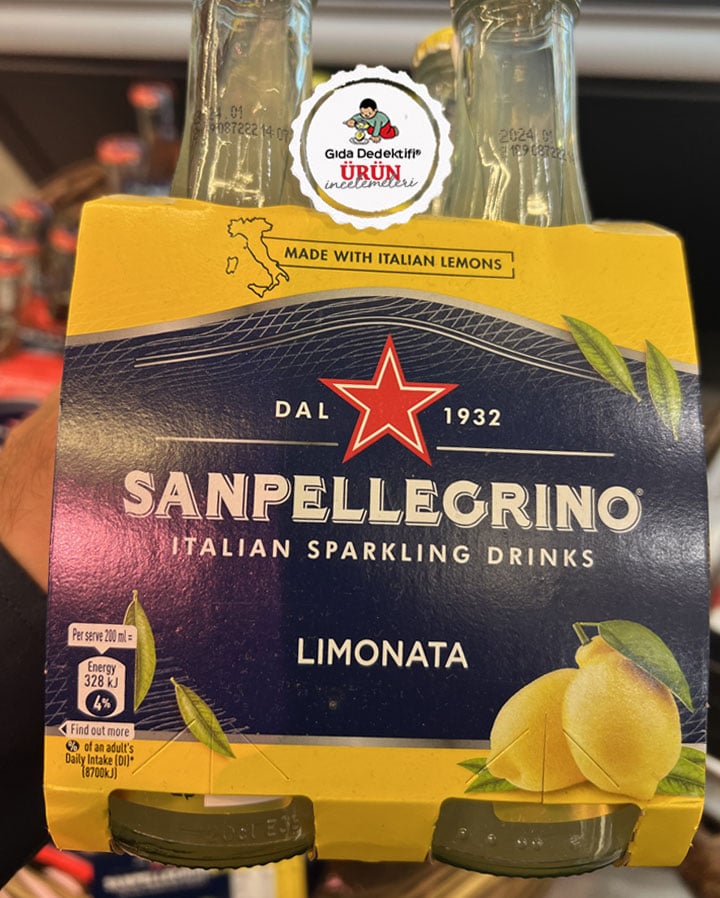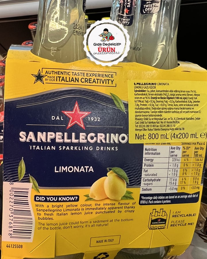Ülkemizde bindelik hatta onbindelik limon suyu içeriğiyle ve yapay aroma vericilerle satışa sunulan limonataların yanında Macrocenter raflarında tespit ettiğimiz bir ürünü inceleyeceğiz; San Pellegrino Limonata. Ürün ambalajından da anlaşılacağı üzere İtalya’da üretilerek ülkemize ithal ediliyor. Ürünün ithalatçısı olarak geçtiğimiz yıllarda Nestlé tarafından satın alınan Erikli markasını görüyoruz. Ürün paketinde tek adedi 200 ml olan şişelerde sunulan 4’lü limonlu gazlı içecek bulunuyor.