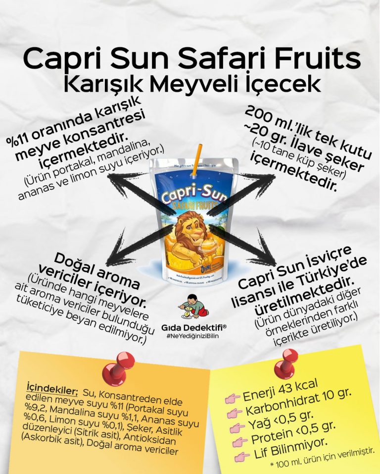 İşte bu içeriklerle “İtalyan limonlarıyla üretildiği” beyan edilen ürün tek şişede 78 kcal enerji veriyor. Ürünün tek şişesinde 15,6 gr yani yaklaşık 8 tane küp şeker kadar ilave şeker bulunuyor. Ürün liften yoksun olduğundan tek şişede alınan bu şeker direkt olarak kana karışıyor. Buna göre üründen alınan kalorinin tamamına yakını ilave şekerden geliyor. Üründe koruyucu katkı maddesi, yapay aroma verici, tatlandırıcı ya da renklendirici gibi bileşenler yer almıyor. #NeİçtiğiniziBilin