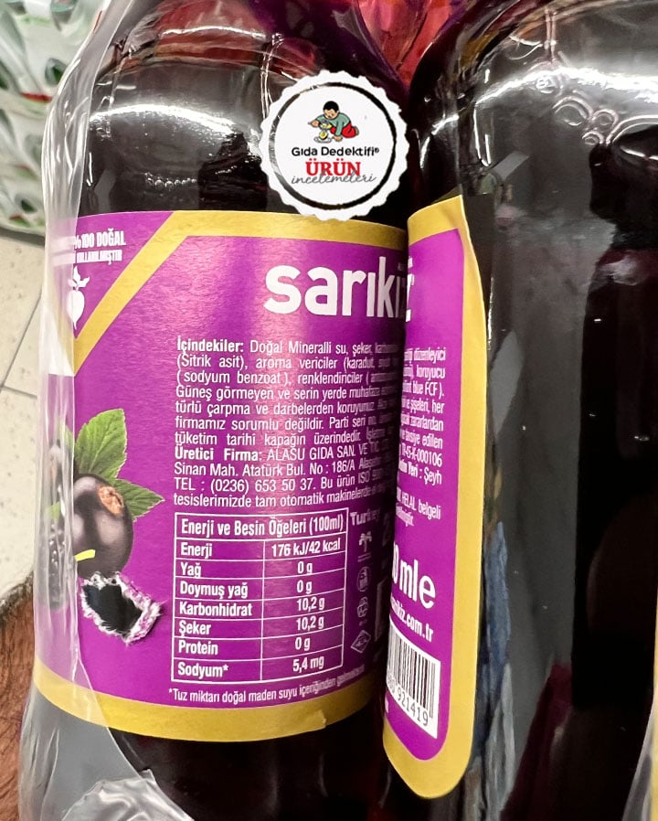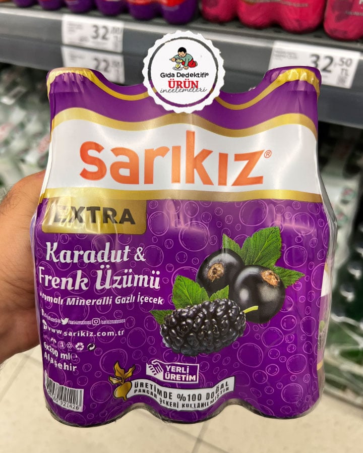 Sarıkız markasıyla satışa sunulan ve ambalajında frenk üzümü ve karadut görselleriyle dikkat çeken aromalı maden sularından birini inceleyeceğiz; Sarıkız Extra Karadut & Frenk Üzümü Aromalı Mineralli Gazlı İçecek. Ürün 200 ml’lik cam şişelerde tekli ve 6’lı paketler halinde satışa sunuluyor. Ürün ambalajında “Üretimde %100 doğal pancar şekeri kullanılmıştır” ifadesi yer alıyor. Ürün şeker pancarından elde edilen rafine şeker içerirken, nişasta bazlı glikoz-fruktoz şurubu veya türevlerini içermiyor.