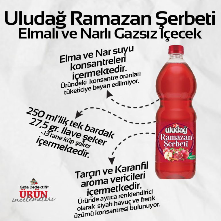 Ürün içeriğine baktığımızda ilk 3 sırada; Su, Şeker veya Glikoz-fruktoz şurubu ile Karbondioksit bulunduğunu görüyoruz. Yani ürün ilave şeker olarak sofra şekeri veya nişasta bazlı şeker içermektedir – ki bu durum da ürün kapağında -S veya -F harfleriyle tüketiciye beyan edilmektedir.Üründe bu haliyle 250 ml.’lik tek adette 22,3 gr. yani yaklaşık 11 tane küp şeker kadar ilave şeker bulunmaktadır. Üründe tek şişede tamamı ilave şekerden gelen 92 kcal enerji bulunmaktadır. Üründe bunun dışında herhangi bir besin değeri bulunmuyor.
