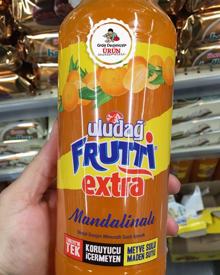“Koruyucu içermeyen tek maden suyu” olarak reklamları yapılan Uludağ Frutti Extra ürününü inceliyoruz. Ürün 250 ml’lik cam şişelerden sonra artık litrelik şişelerde de satılmaya başladı. Ürün ambalajında “koruyucu içermediği” yönünde ifadelere yer verilirken üründeki diğer katkı maddeleri ancak yasal beyan kısmında görülebiliyor. Üründe sofra şekeri ilavesi de yer alırken, herhangi bir tatlandırıcı ya da nişasta bazlı şeker bulunmuyor.