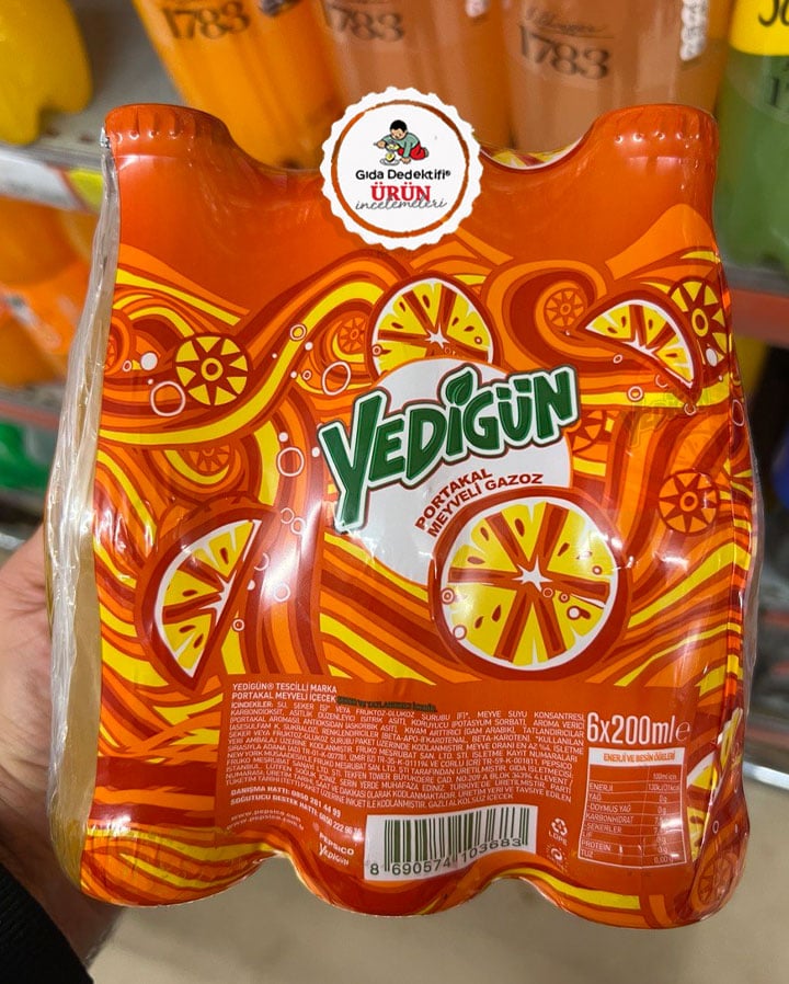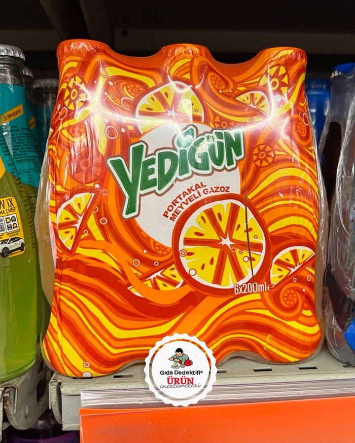 Türkiye’de çok uzun yıllardır üretilerek portakallı gazoz olarak tüketilen Yedigün markalı ürünü inceleyeceğiz. Ürün Pepsico firması tarafından üretilmekte olup, etiketteki ifadeyle “Pepsico New York müsaadesiyle” Fruko Meşrubat firması tarafından Adana, İzmir ve Çorlu’daki Pepsi fabrikalarında üretilmektedir. Ürün 6’lı paketlere satılmakta ve 200 ml’lik şişelerde tüketiciye sunulmaktadır.